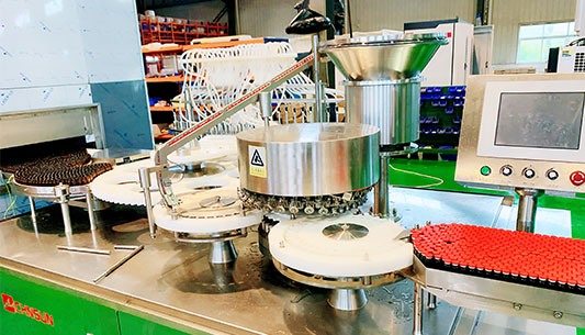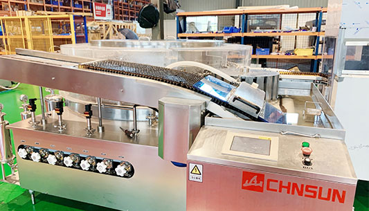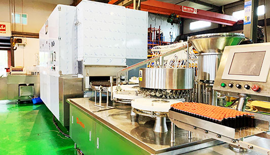 采用超聲波清洗及水氣交替沖洗、熱風(fēng)循環(huán)式高溫滅菌、多頭灌裝與封口等技術(shù)。整線聯(lián)動自動控制。操作簡單方便,實現(xiàn)了機電一體化。