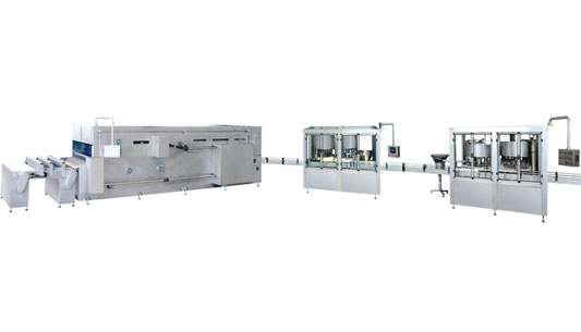 全線由QJB600超聲波洗瓶機(jī),GCF600灌裝塞塞機(jī),F(xiàn)GL600軋蓋機(jī)組成。另外還可配置SSP600上瓶機(jī),SXP600卸瓶機(jī),SDJ600燈檢機(jī),TNZ300直線貼標(biāo)機(jī),DSW300熱收縮膜包裝機(jī),KJ封箱機(jī)等輔助機(jī)組。能自動(dòng)完成理瓶、輸瓶、瓶?jī)?nèi)外表面粗洗、灌裝、壓塞、理蓋、軋蓋、輸瓶等工序,輔助設(shè)備可完成上瓶、卸瓶、燈檢、貼標(biāo)、包裝等工序。